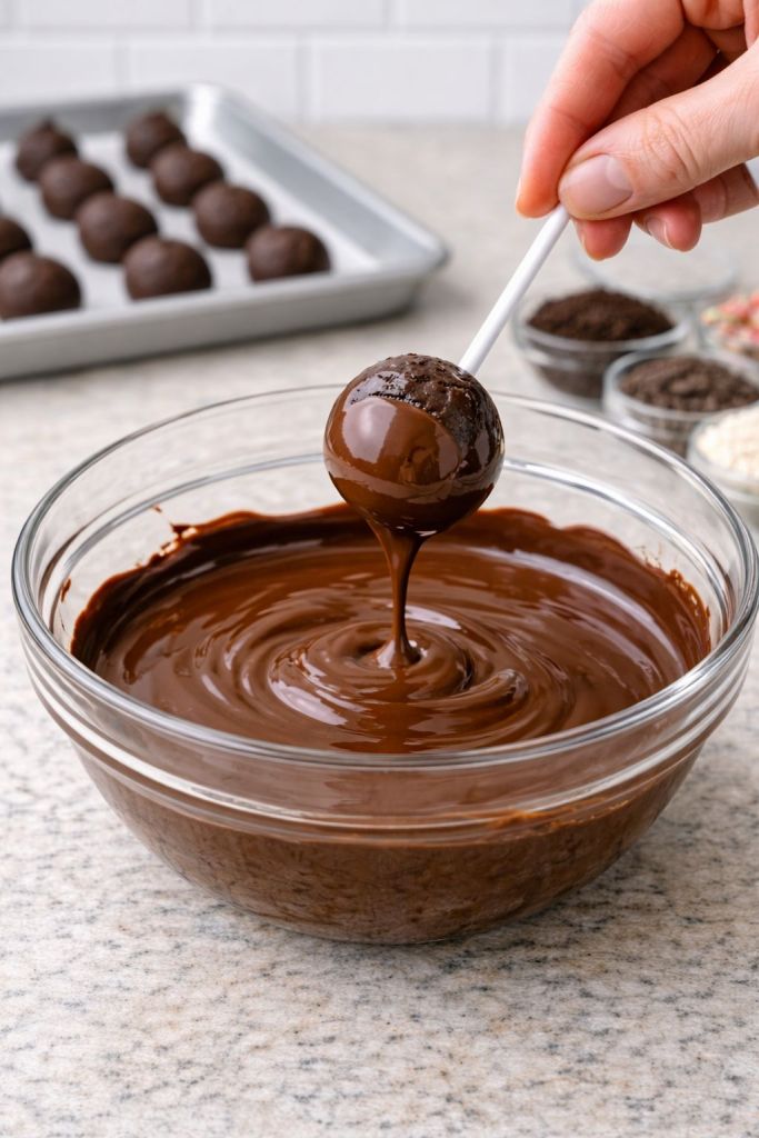 - Work in small batches (about 5–6 cake pops at a time) to prevent softening.