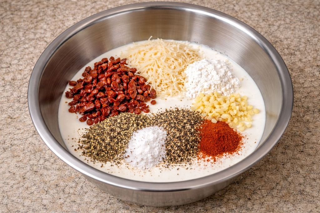 - In a mixing bowl, whisk together heavy whipping cream, cornstarch, garlic, salt, and pepper until smooth.